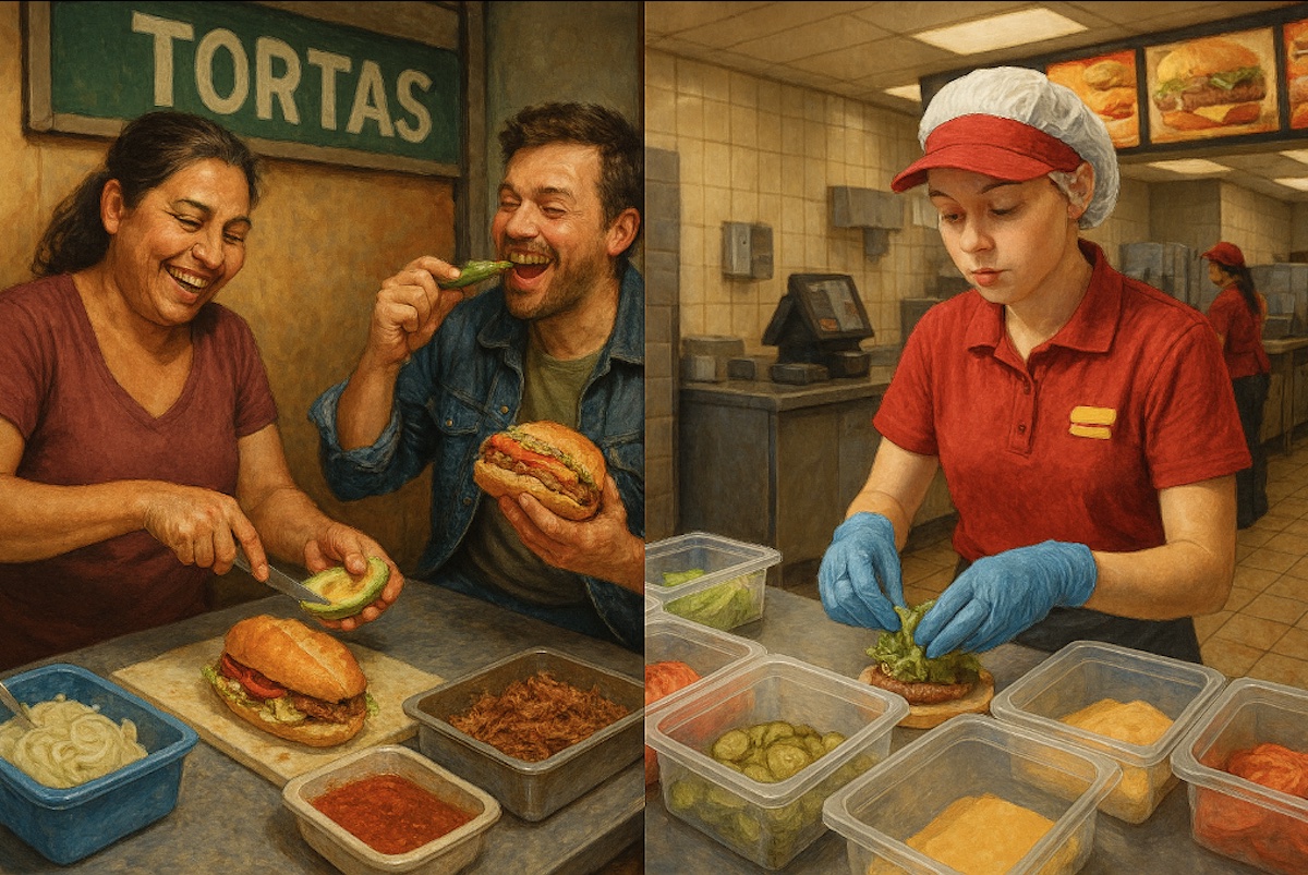 Comida que se vende. Tacos o tortas pueden comerse rápido, pero su consumo inmediato no convierte a estos alimentos en “comida rápida” (fast food) porque eso depende de una estructura culinaria donde interviene su preparación. Si hubiera que establecer una diferencia básica entre una torta y una hamburguesa, que sí corresponde al fast food, es la preparación de los ingredientes que las componen. Los rellenos de las tortas se guisan en los locales; los de las hamburguesas, están precocinados.