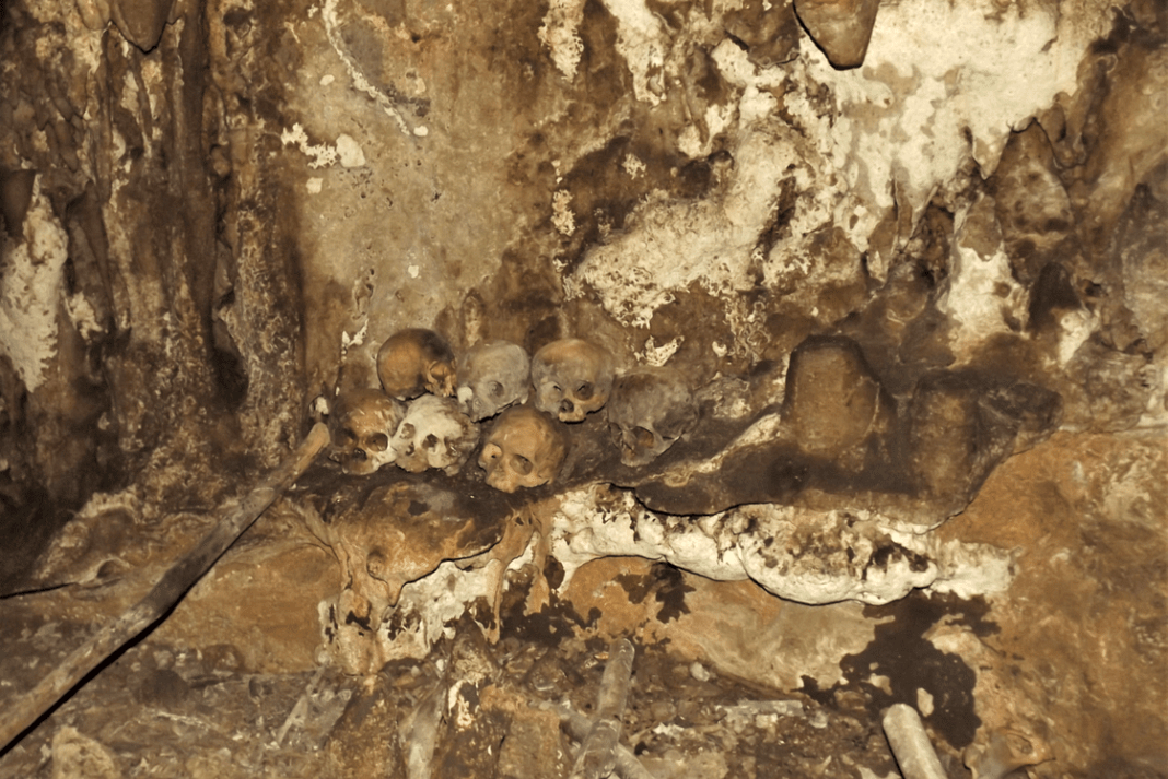 Tras analizar unos 150 cráneos hallados en la cueva, los científicos determinaron que corresponden a personas decapitadas entre los años 900 y 1200 d. C., y teorizaron que incluso existió allí un tzompantli.