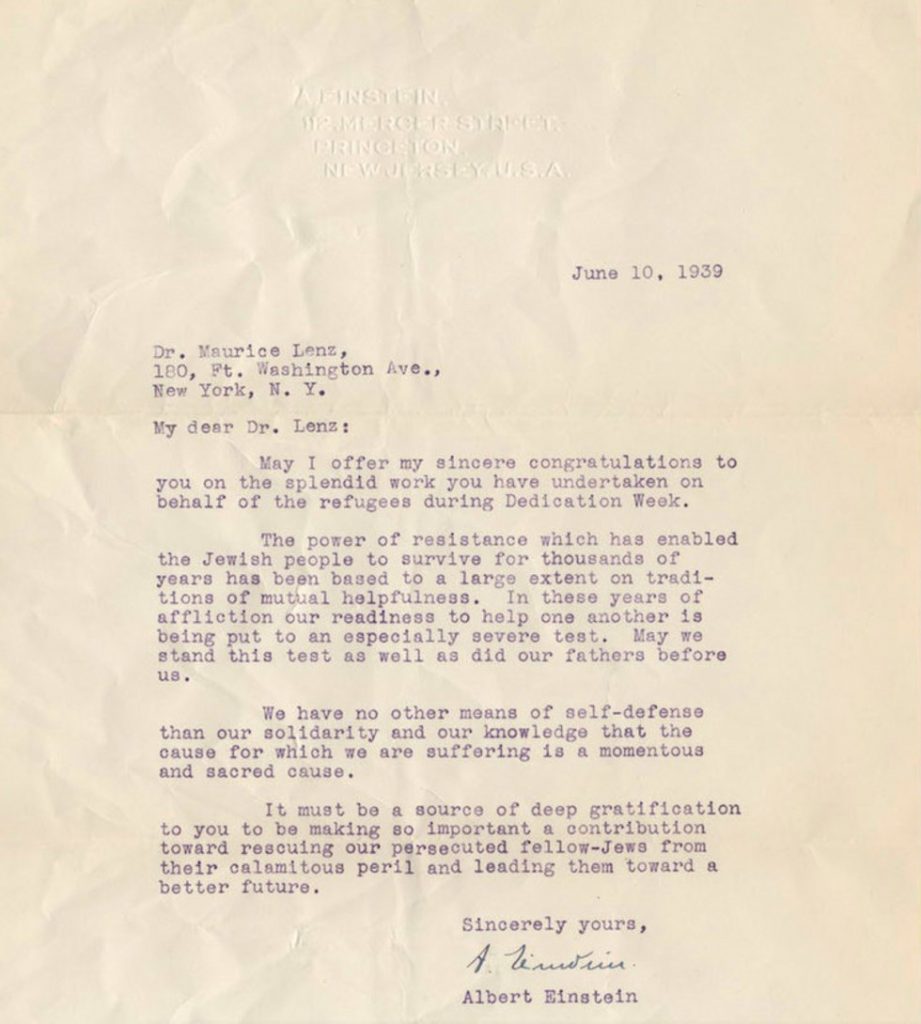 En una de las cartas a subastar, con fecha del 10 de junio de 1939, Einstein escribió a Maurice Lenz, un líder en el campo de la terapia de radiación en la Universidad de Columbia, Nueva York. Pero Einstein no discutió la investigación de Lenz en la nota, sino que lo felicitó por su trabajo en beneficio de los refugiados judíos durante la Segunda Guerra Mundial.