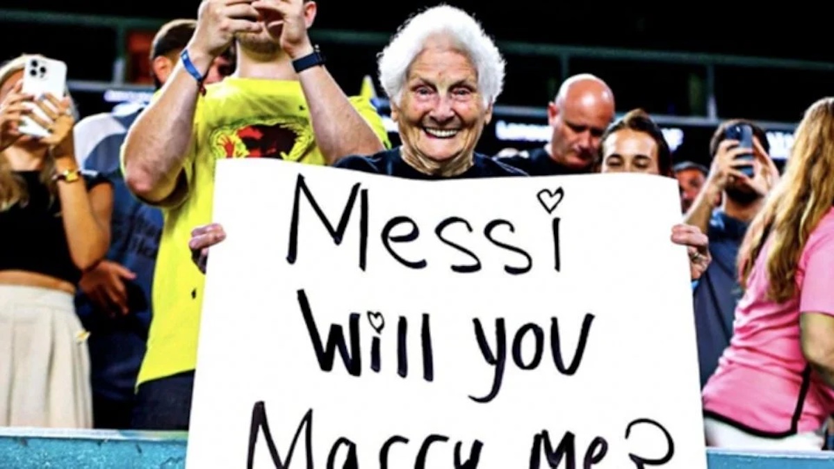 Una aficionada que presuntamente es la abuela de un influencer llamado Ross Smith, mostró una pancarta en la que le pedía matrimonio a Lionel Messi: “¿Messi, quieres casarte conmigo?”, se leía.