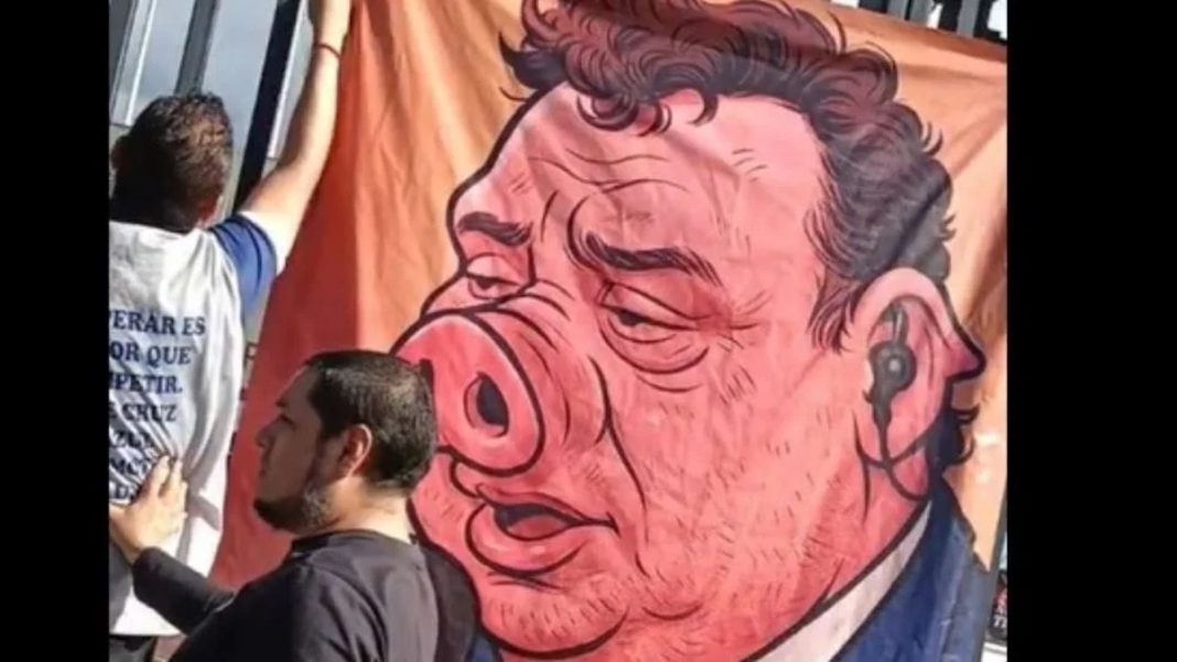 Hoy, un grupo reducido de seguidores celestes colgaron una manta en las inmediaciones del Estadio Olímpico Universitario con una imagen exagerada del comunicador al estilo ‘porcino’.