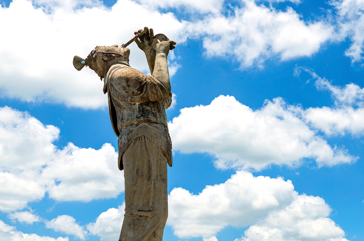 La escultura refleja la imagen de un Caporal de los Voladores de Papantla, bailando en la cima del poste y tocando una flauta y un tambor. El caporal es el que en este ritual prehispánico representa al espíritu, interpreta la música que honra al sol y a los cuatro puntos cardinales, y además, guía a sus compañeros mientras estos descienden volando en círculos utilizando cuerdas que son atadas a sus tobillos, como una manera de invocar a sus dioses la fertilidad del campo y la buena salud.