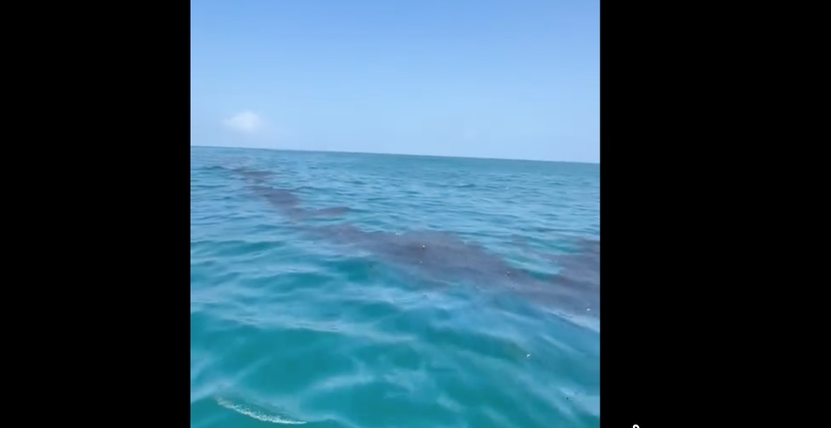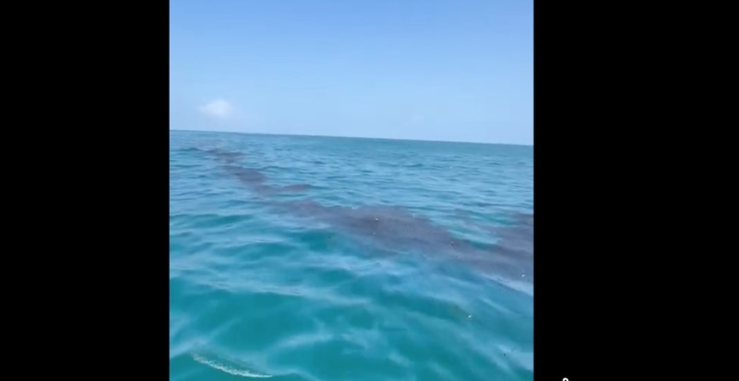 El líder de pescadores en Alvarado, Jaime Santiago, informó que durante recorridos en la franja costera se identificó una amplia mancha de petróleo crudo que se extiende desde la zona de escolleras hasta el punto donde permanece un barco encallado frente a las costas del municipio.