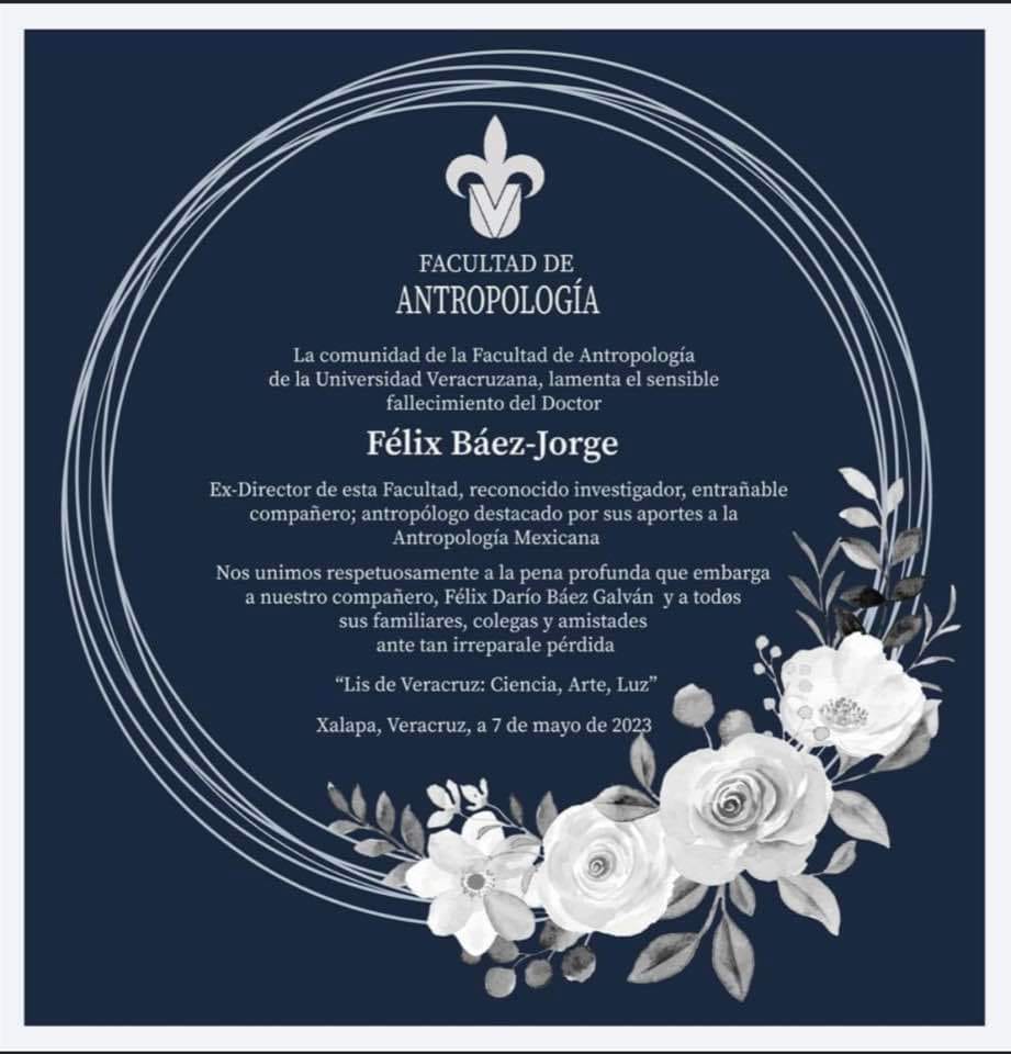 El día de hoy falleció aquí en Xalapa el antropólogo Félix Báez-Jorge egresado de la Universidad Veracruzana (UV), y secretario académico de esa casa de estudios, durante el periodo como rector de Rafael Hernández Villalpando.