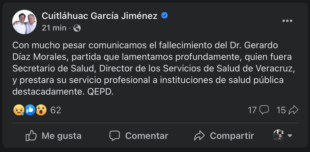“Con mucho pesar comunicamos el fallecimiento del Dr. Gerardo Diaz Morales, partida que lamentamos profundamente, quien fuera Secretario de Salud, Director de los Servicios de Salud de Veracruz y prestara sus servicio profesional a instituciones de salud pública destacadamente”, publicó el mandatario.