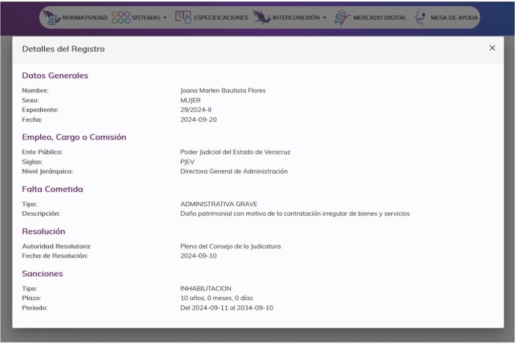 Sin embargo, omitió precisar que su sanción fue impuesta por el Poder Judicial de Veracruz, no por la Contraloría General, por lo que las constancias que exhibe —emitidas por la Contraloría General del Estado y la Secretaría de Anticorrupción y Buen Gobierno— no invalidan la resolución judicial. También ha solicitado al Sistema Estatal Anticorrupción de Veracruz eliminar su registro de la Plataforma Nacional de Personas Sancionadas, argumentando sin fundamento que esos oficios bastan para desaparecer la sanción inscrita.