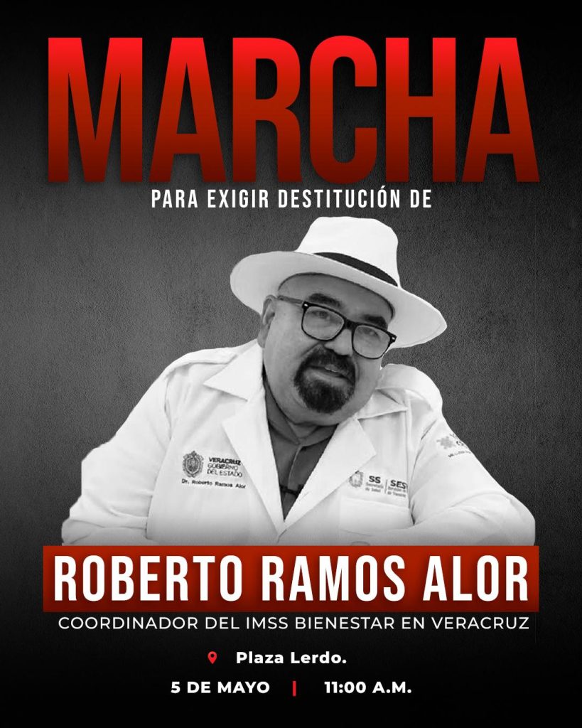 Cabe mencionar que también circula en redes sociales la convocatoria para una marcha en la que se exigirá la destitución de Roberto Ramos Alor como coordinador del IMSS Bienestar en Veracruz, la cual está programada el próximo 5 de mayo, en la Plaza Lerdo, a las 11 horas, en la ciudad de Xalapa.