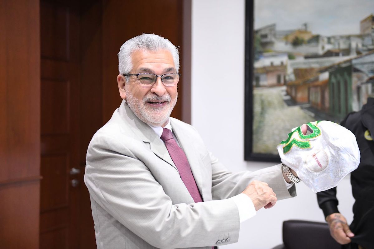Finalmente, Fernando Landa obsequió al alcalde Alberto Islas Reyes una máscara con el logotipo del municipio y una imagen de la emblemática Araucaria de Xalapa, en agradecimiento al apoyo que brinda a la lucha libre.