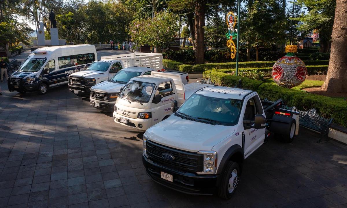 Durante el acto protocolario realizado en el parque Benito Juárez, se entregó un vehículo Transit Bus a la Policía Municipal; una camioneta con plataforma a la Dirección de Desarrollo Económico; una camioneta plano largo a la Coordinación de Imagen Urbana, y una camioneta F-150 a las direcciones de Limpia y Alumbrado Público.