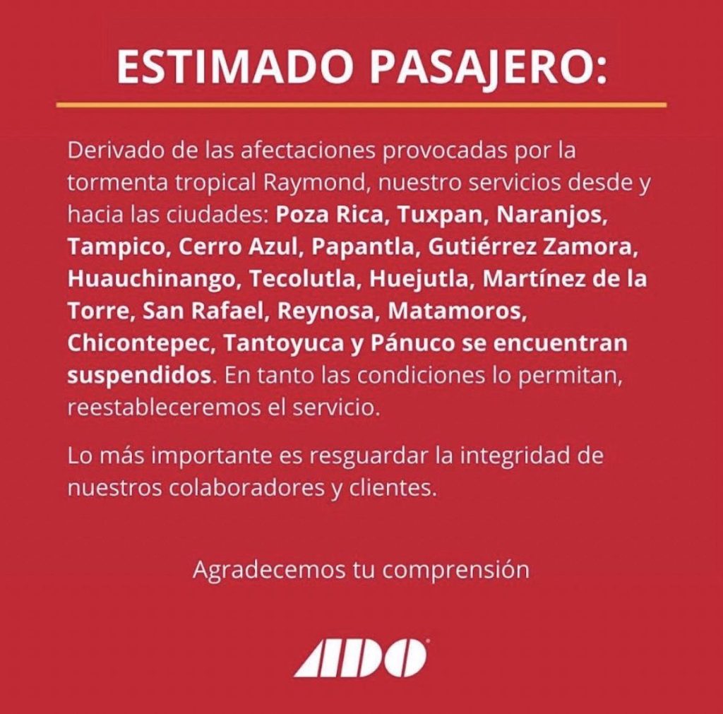 Las clases han sido suspendidas en más de 39 municipios veracruzanos para reducir riesgos a estudiantes. También, la empresa de transporte ADO ha anunciado la suspensión de servicios en municipios severamente afectados.