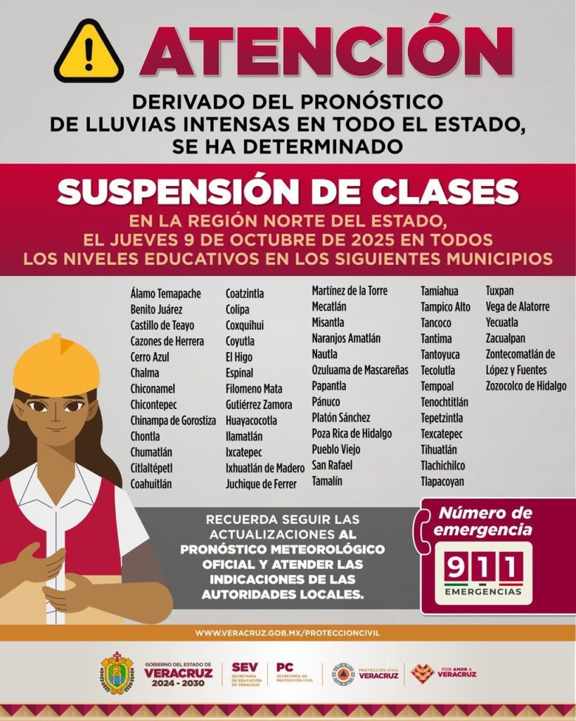 La Secretaría de Protección Civil de Veracruz dio a conocer que este jueves 9 de octubre también habrá suspensión de clases en todos los niveles educativos, aunque para este día solamente aplicará para 58 municipios, la mayoría de estos en la zona norte del estado.