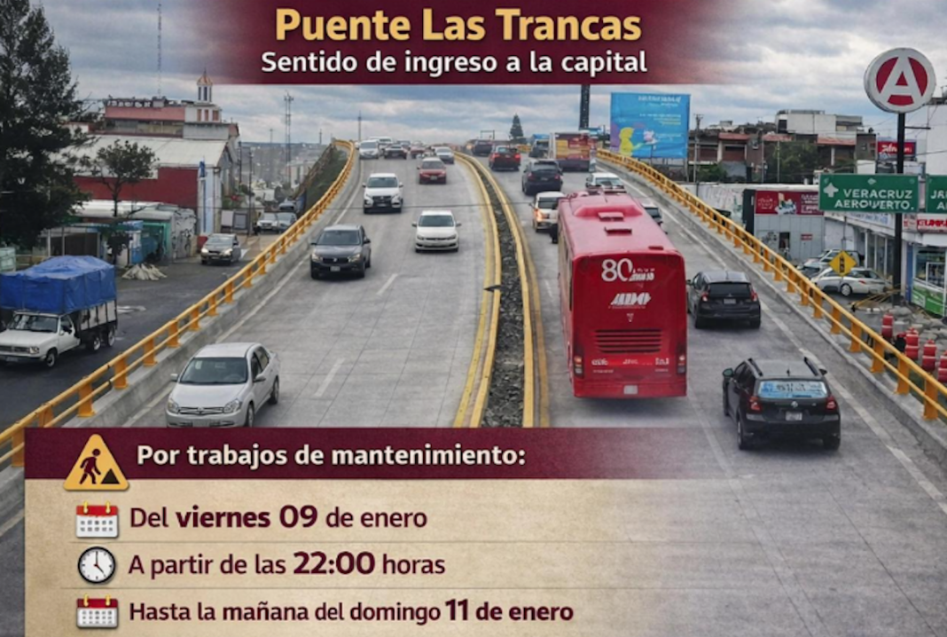 La Secretaría de Infraestructura y Obras Públicas (SIOP) anunció el cierre parcial del puente Las Trancas, en el carril de ingreso a Xalapa, a partir de las 22:00 horas de este viernes y hasta la mañana del domingo 11 de enero, bajo el argumento de realizar trabajos de “mantenimiento”.