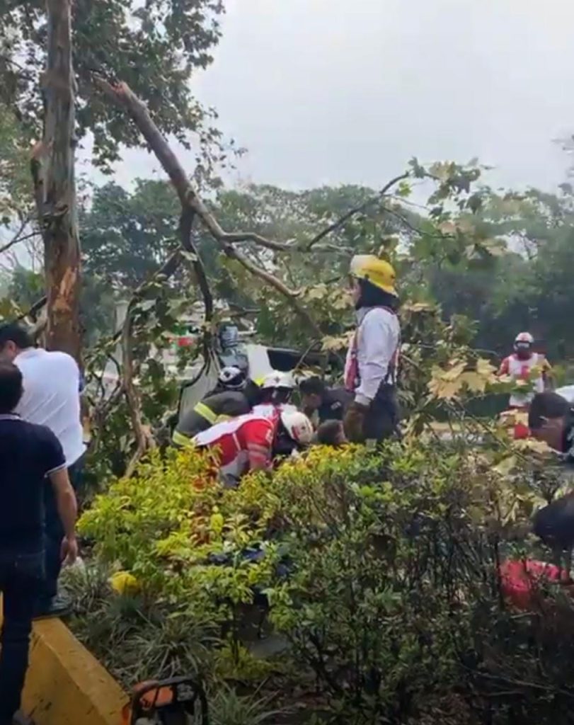 Xalapa. – Trabajadores del Ayuntamiento de Xalapa tuvieron un accidente vehicular en la avenida Rafael Murillo Vidal luego de que chocaron contra un árbol y les cayó encima una de las ramas.