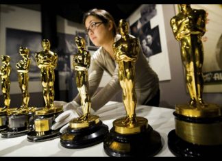 Gregg Donovan sostiene una estatuilla falsa del Óscar y un cartel de una película frente a Union Station durante los preparativos para los premios de la Academia.