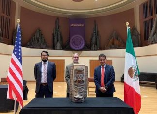 El cónsul en Detroit, Fernando González, y los investigadores Josuhé Lozada y Joel Palka posan junto a la urna maya restituida a México, el 14 de abril de 2021. Foto cortesía de las secretarías...