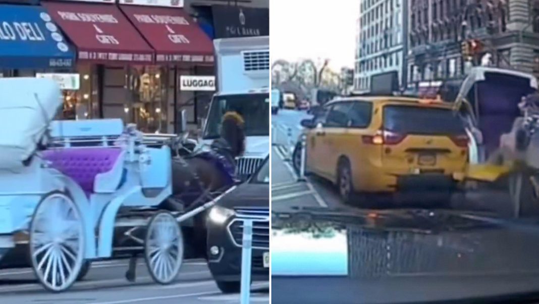Un carruaje tirado por un caballo se salió de control en calles de Nueva York y cruzó de manera intempestiva entre el tráfico, generando momentos de tensión entre automovilistas y peatones. El hecho, captado en video, muestra cómo el vehículo avanza sin control hasta impactarse contra un automóvil.