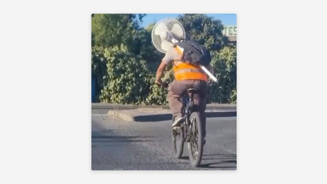 En el video, que comenzó a difundirse en redes sociales, se observa al hombre avanzar en su bicicleta mientras el aparato eléctrico sobresale de la parte superior de la mochila, aparentemente en funcionamiento. El objetivo: enfrentar las altas temperaturas que se han presentado en la zona.