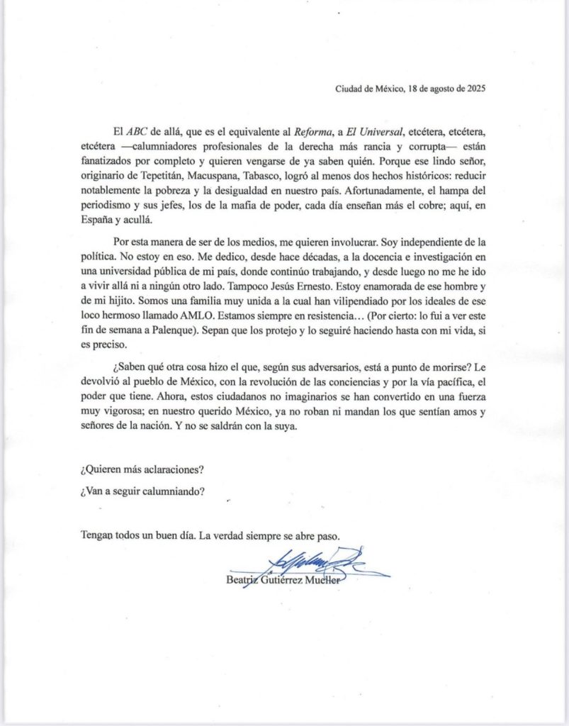 Beatriz Gutiérrez Müller, esposa del expresidente Andrés Manuel López Obrador, negó este lunes 18 de agosto de 2025 las versiones periodísticas de que viviría en España junto a su hijo Jesús Ernesto.