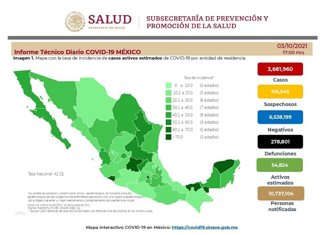 En cuanto a las vacunas aplicadas contra la infección, el informe de la dependencia federal indica que el sábado fueron 338 mil 206 dosis. Hasta ahora se han utilizado 102 millones 643 mil 418 en 64 millones 323 mil 90 personas. De estas, 72 por ciento ya tiene el esquema completo.