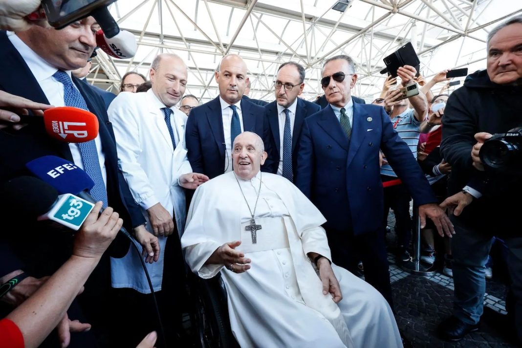 El pontífice salió por la puerta principal del hospital a las 8:00 h local en silla de ruedas y le esperaban, además de los medios, algunas decenas de personas.