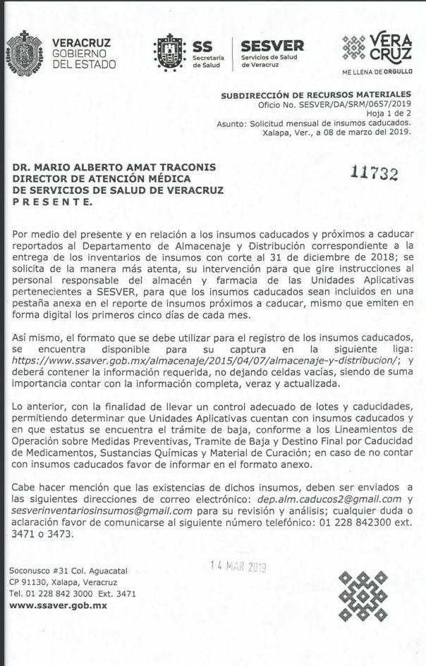 Así lo establece el oficio número SESVER/DA/SRM/0657/2019 donde el subdirector de Recursos Materiales, Antonio Pola Navarro solicita al director de Atención Médica, Mario Alberto Amat Traconis hacer inventario y reporte mensual de las medicinas caducas o que estén por vencer.