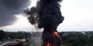 La mañana de este viernes una pipa cargada con combustible se incendió tras caer del puente Caracol, a unos pasos del puente Coatzacoalcos.