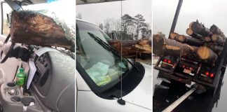Un hombre conducía una camioneta por una carretera de EE.UU. detrás de un camión cargado de troncos cuando, de repente, uno de estos salió...